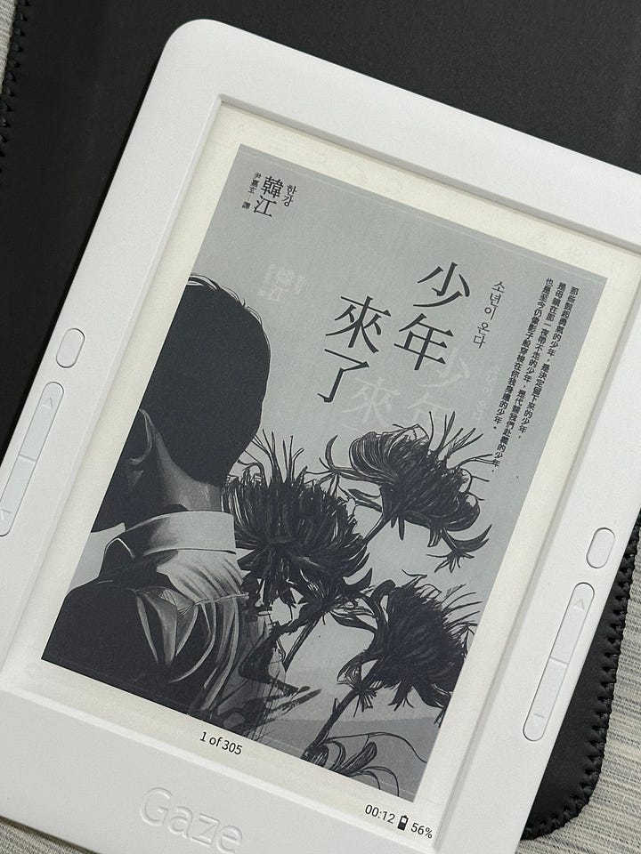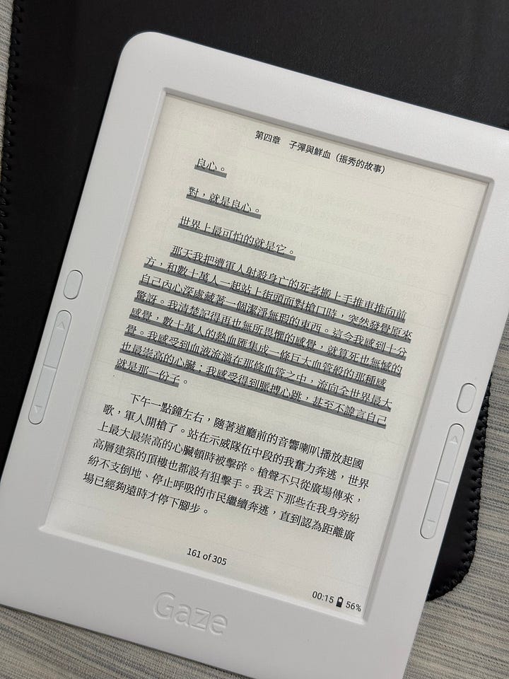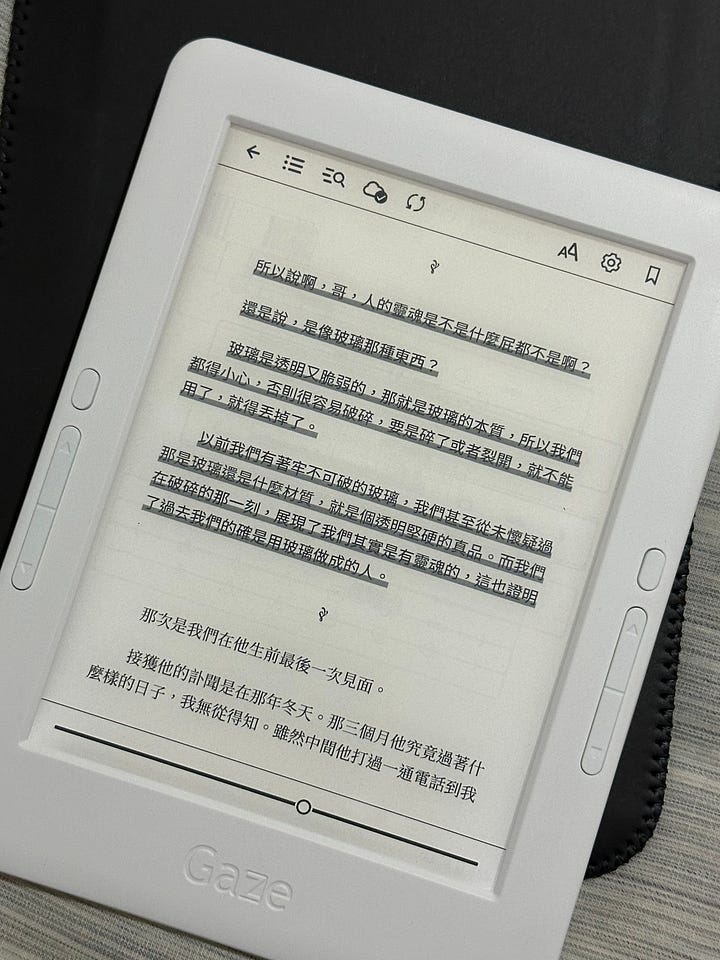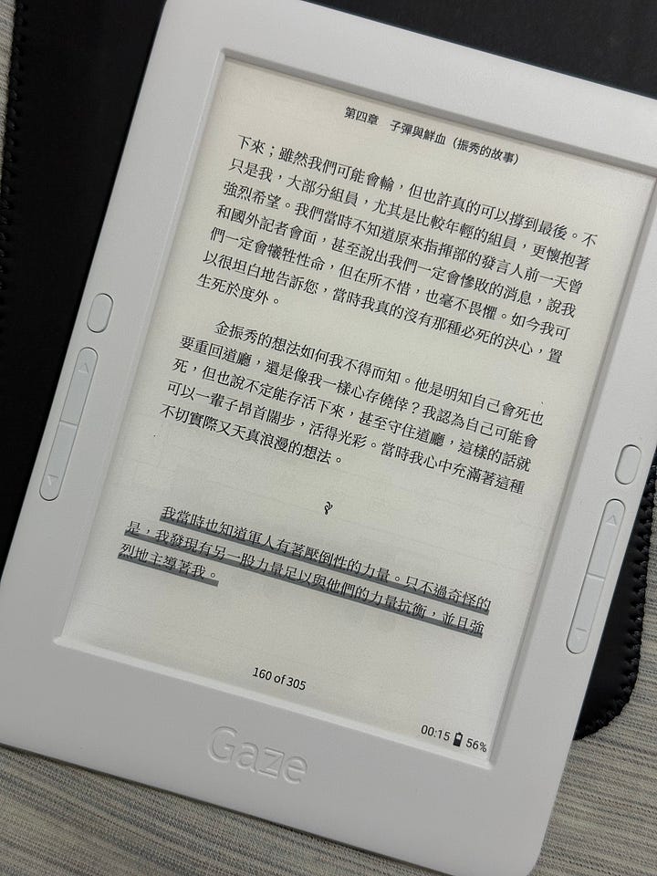 先前看了一些關於閱讀器的分享,因為還是常用圖書館的借書服務,所以選了開放式的 Hyread。為了攜帶方便選擇最小的 6 寸 Gaze Mini。至今入手約三週,覺得體驗非常好。兩邊都有翻頁按鈕,讓不管左手或是右手拿都可以簡單翻頁。在較擁擠得捷運上或是被窩裡也可以輕鬆看書,讓進度不知不覺加快許多。